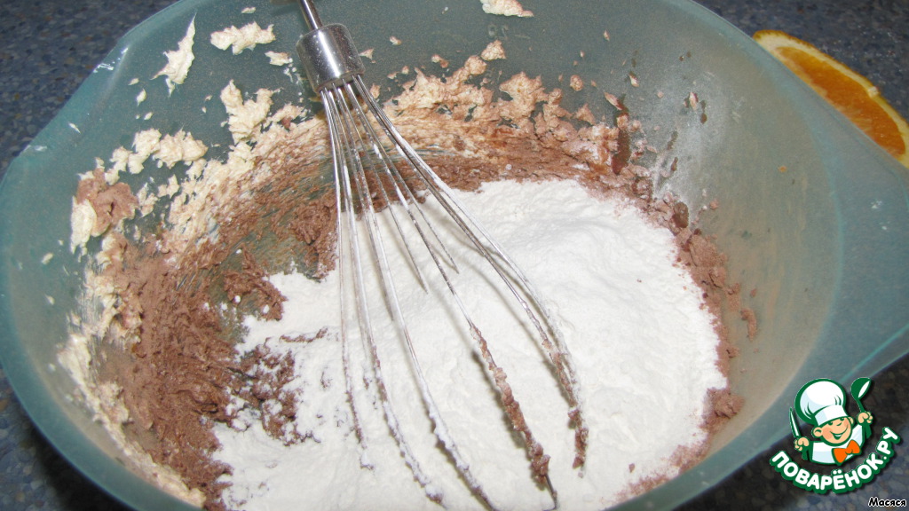Масло хорошо растереть с сахаром до белого цвета. Добавить какао.