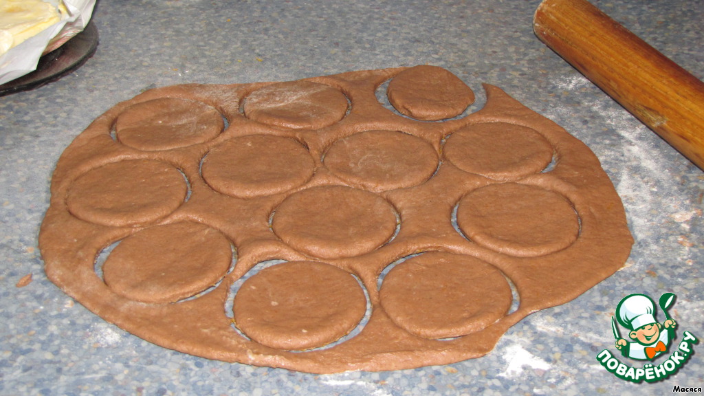 Тесто раскатываем не очень тонко и стаканом или формочками вырезаем печенюшки.