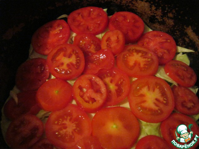 Не переживайте, капусты не будет слишком уж много, так как она осядет. Итак, на мясо одним слоем - рваные листья капусты, на слой капусты - репчатый лук, порезанный кольцами, приправить.