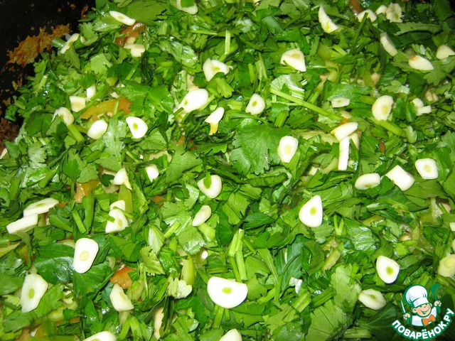 Следующий слой - зелень. Я взяла 4 пучка зелени на рынке - петрушка, сельдерей, укроп, кинза, нарубила всю зелень, перемешала и высыпала ковром на нашу домляму. Сверху чеснок. Несколько зубчиков нарубила ножом. Если вы не любите вкус чеснока, то достаточно добавить его для аромата. Я напишу - как чуть позже.