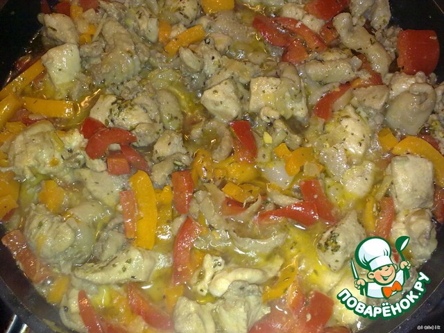 Добавить нарезанный кусочками сладкий перчик и чеснок. Перемешать и жарить 2 минуты