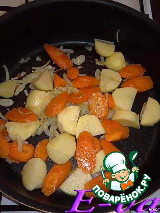 Немного позже добавляем картофель и тоже слегка обжариваем.