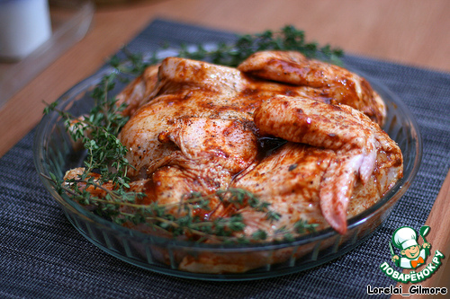 Смазала как следует курочку, уложила в форму, добавила пару свежих веточек тимьяна, что вовсе не обязательно, и отправила в духовку.