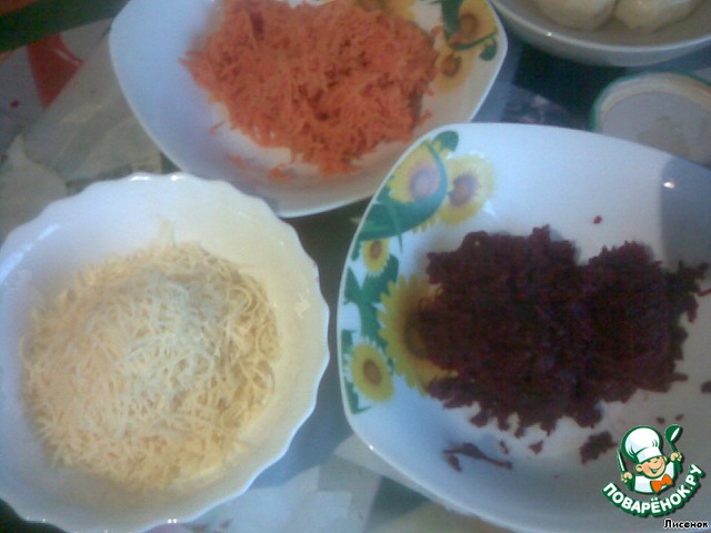 Сыр поровну добавить к свекле и моркови.