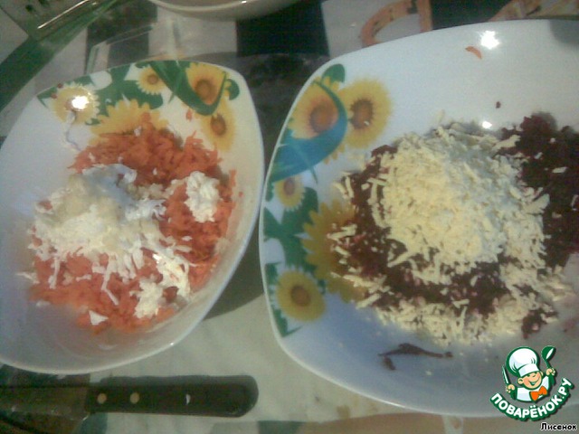 В свеклу добавить тертый желток, в морковь тертый белок и давленный чеснок.