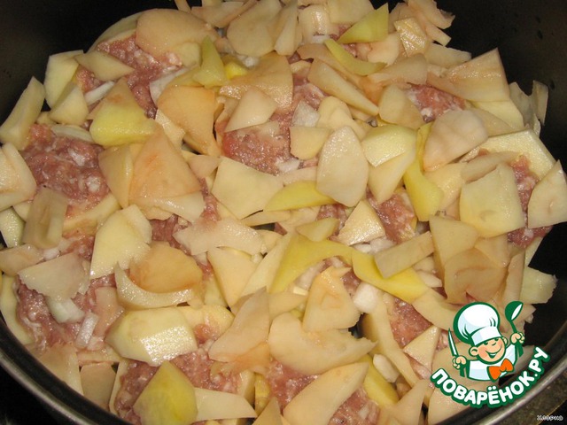 Заполнить этим фаршем картофель и уложить его в кастрюлю. Это будет первый слой.