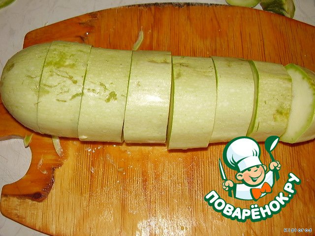 Кабачок моем, срезаем носик и попку, нарезаем кружочками.