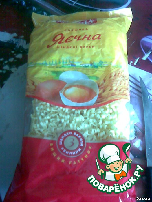 Вот такая лапша потребуется. Это не та,которую надо залить и готово. Она тоже быстрой варки-3 мин.