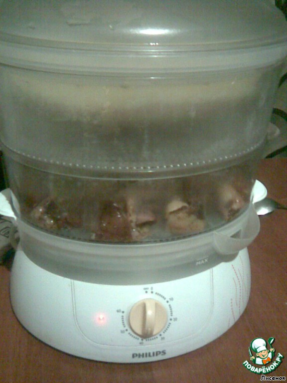В самый нижний поддон укладываем мясо.
