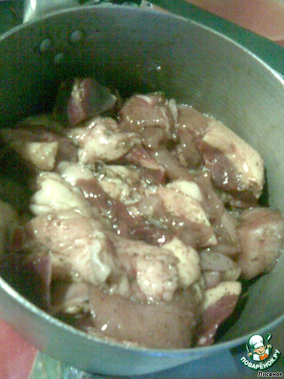 Прежде всего маринуем мясо. У меня была куриная грудка (1/2), печень, сердце и желудок утиные, крыло и окорочок утиные. Порезать их как можно мельче.