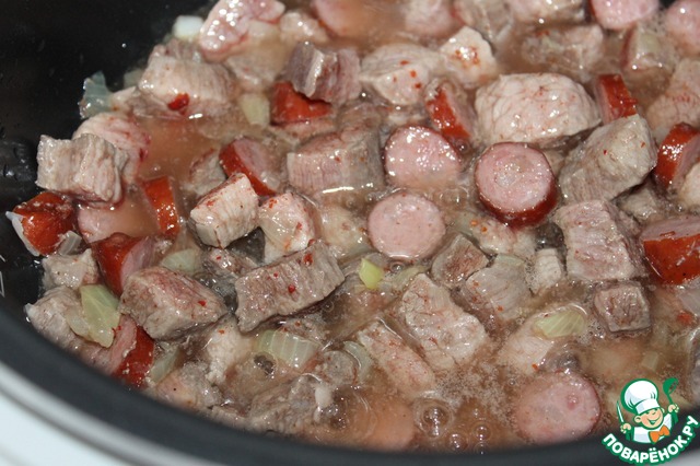 Добавить говядину с колбасками, обжарить до румяности