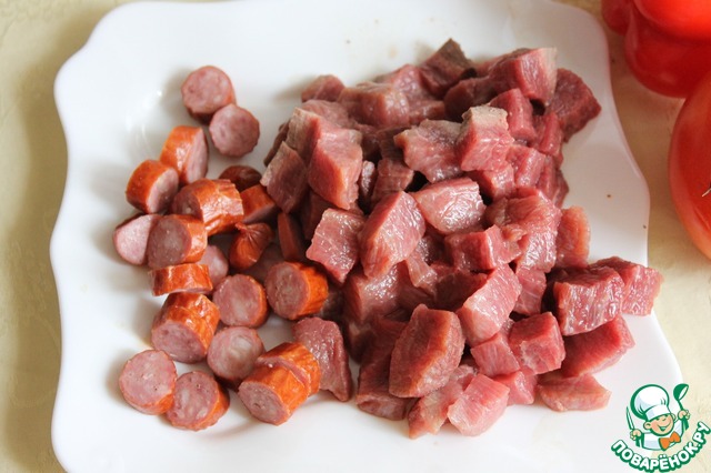 Колбаски порезать кружками, говядину кубиками 1х1 см