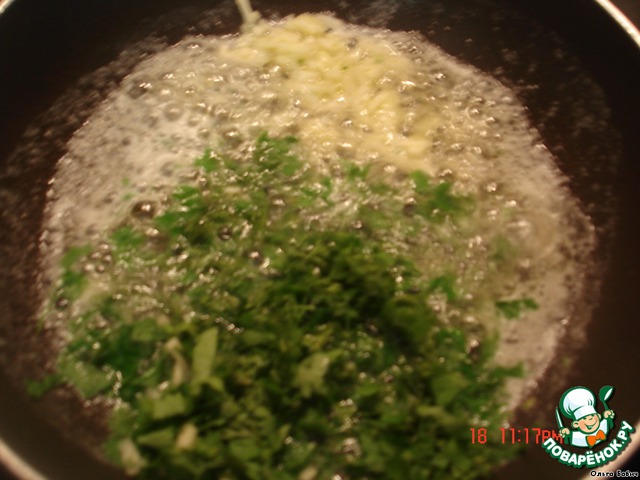 растопить сливочное масло, слегка подрумянить чеснок (порезанный мелко и зелень