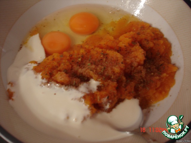 Откинуть тыкву на сито, дать стечь воде. С помощью миксера сделать пюре, добавить яйца, соль, специи, сливки