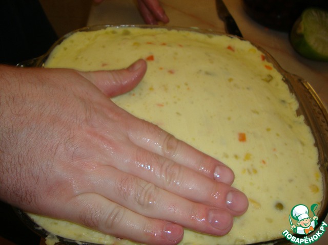 Смазываем форму растительным маслом. Выкладываем картошку в форму. Выравниваем. Я делаю это ладонью. Почаще смачиваю руку под холодной водой.
