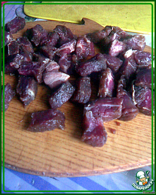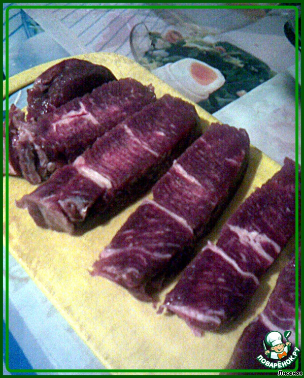 Для начала займемся мясом - замаринуем. Порежем его небольшими кусочками шириной 2,5 - 3 см.