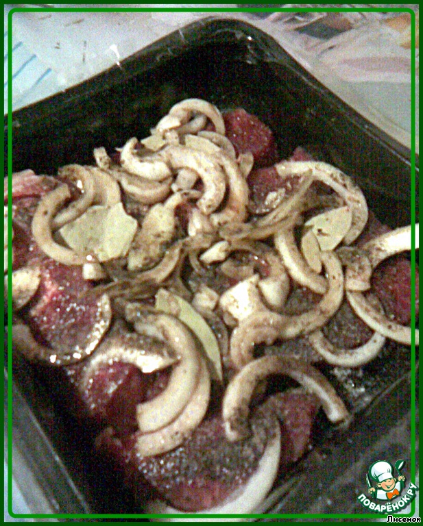 Лук порезать четверть кольцами (1 шт.). Смешать мясо, лук, лавровый лист, сок от одного лимона, соевый соус, соль и перец.