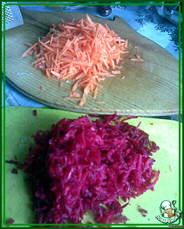 Чистим морковь и свеклу, трем на крупной терке. Обжариваем по отдельности.