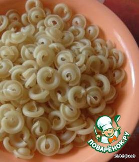 Отвариваем в кипящей подсоленной воде макарончики, промываем холодной водой, откидываем на дуршлаг.