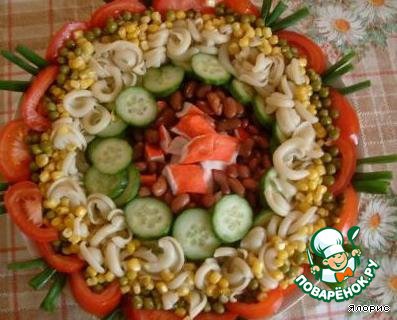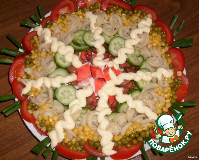 | Целый день провела на любимом сайте, приходила в себя после насыщенных выходных... Но неожиданно наступил вечер, собралась вся семья, и ребром встал вопрос приготовления ужина. Былые заслуги не берутся в расчет, трoe мужчин готовы принимать пищу и на банальные пельмени из морозилки после праздников не очень согласны... Пришлось включить фантазию. На семейном совете (по предложению младшего) решено одобрить блюдо и назвать его "Суперсалат". |