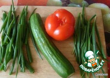 Режем помидорчик, огурчик, зелень. Специально сфоткала зелень чеснока - справа от огурчика, а то народ интересуется, что кладу в салаты - стрелки что ли?