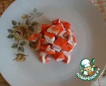 На большом блюде начинаем "формировать" наш салат, начиная от середины - в нее кладем крабовое мясо.