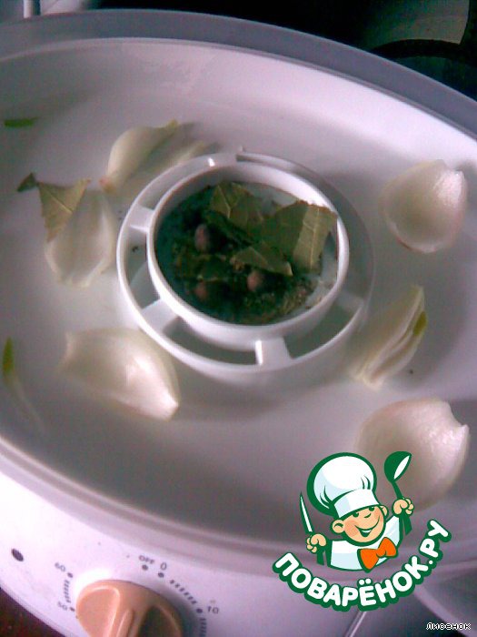 ВЫ пароварке имеется самый нижний контейнер,в который можно закладывать специи,я положила-перец душистый,чеснок гранулированный,лаврушку и прованские травы.1/2 лука репчатого