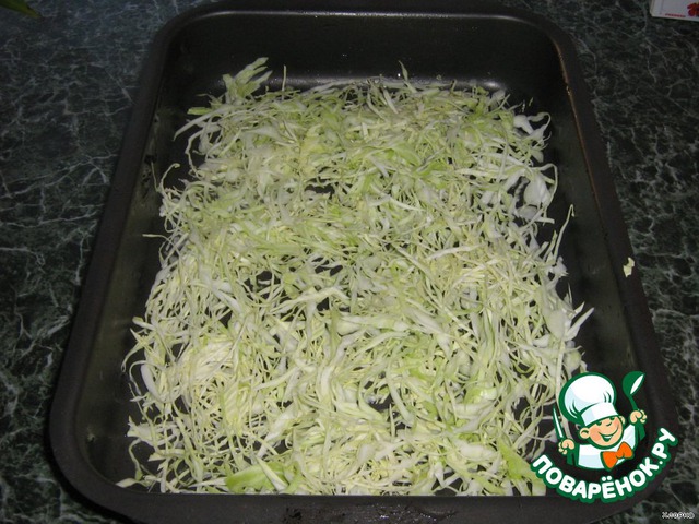 Противень смазываем маслом и кладем первый слой. Это будет капуста, тоненько нашинковать и уложить.
