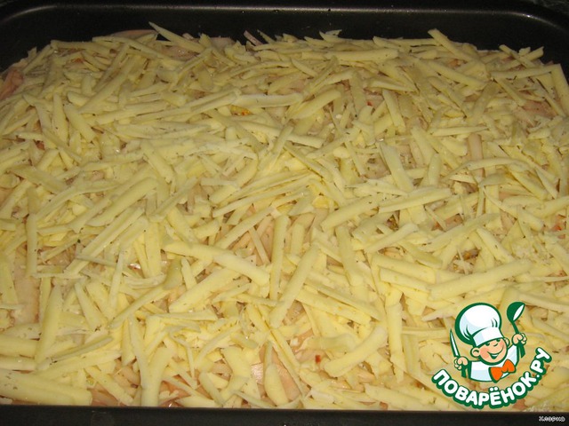 Заливаем соусом и посыпаем тертым сыром, куда ж без него...