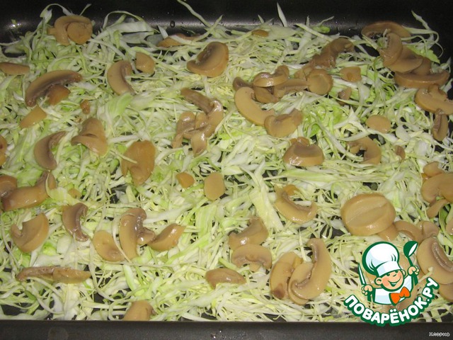 Следом кладем шампиньоны.
