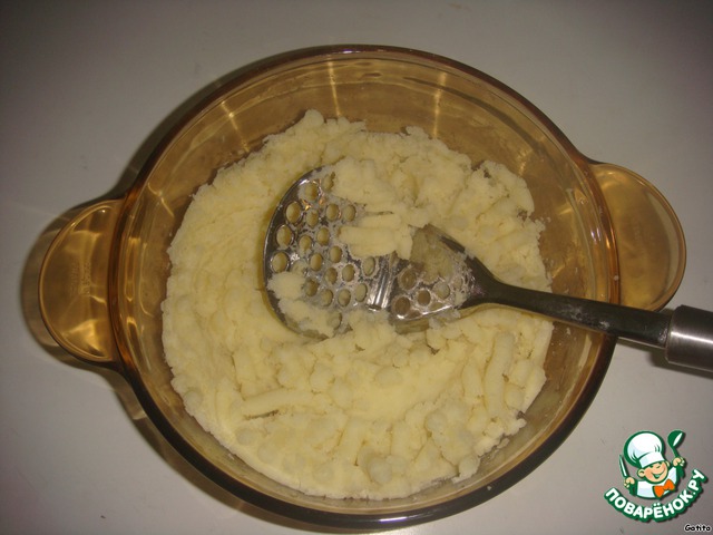 В картофельное пюре добавить 2 ст. ложки сметаны, 2 яйца, натертый на мелкой терке сыр, соль, перец. Перемешать.