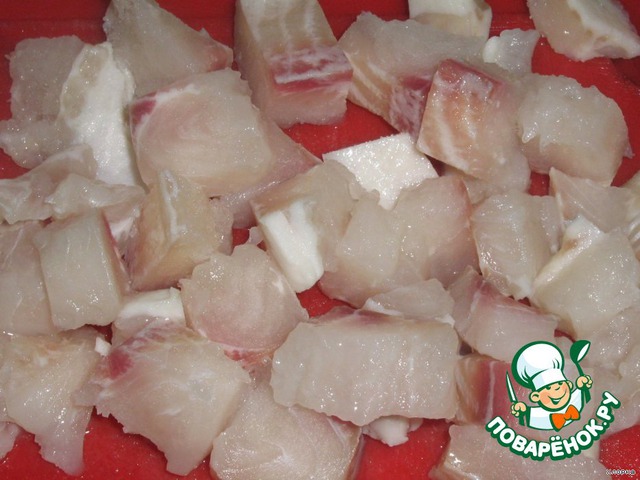 Рыбу разморозить и нарезать кусочками, сбрызнуть лимонным соком.