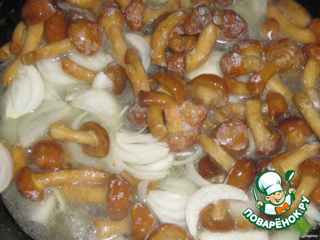 Лук нарезать полукольцами и обжарить вместе с грибами минут 5-10.