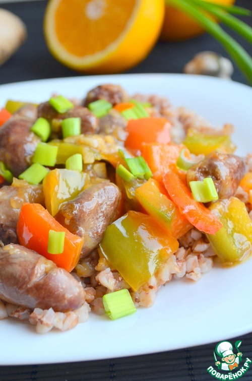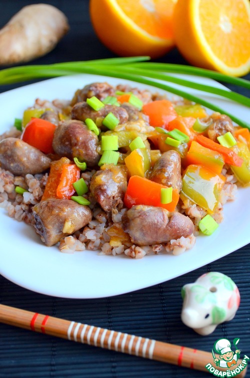 | В китайском стиле! В принципе, вы можете вместо сердечек взять куриное филе, а на гарнир смело использовать рис. Но, если честно, то мне уже поднадоело филе, и я так захотела гречку! Одним словом, сердечки по-восточному сегодня отдали свое сердце русской гречке ;) Нежные сердечки, сладкий перец, и все это покрыто ароматным, пикантным соусом. Получилось замечательно вкусно! Если честно, то приготовила немного и очень-очень об этом пожалела! Завтра повторю, благо готовить-то быстро и просто! |