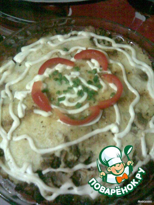 Выложить первым слоем картофельное пюре и капусту