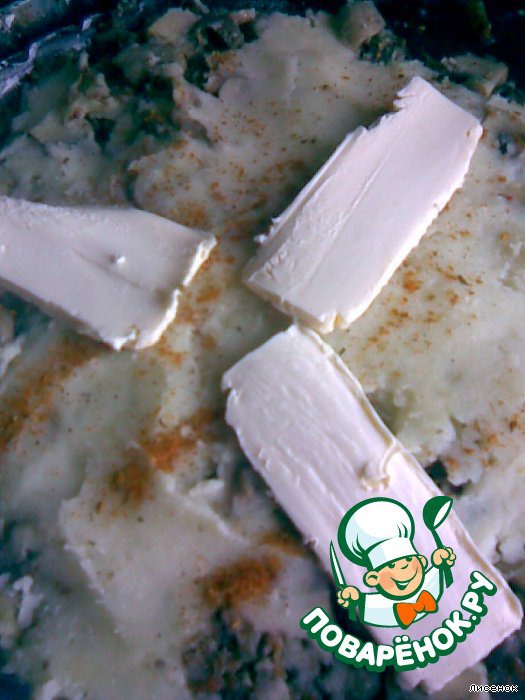 Верхний слой посыпаем специями для картофеля, кладем кусочки масла