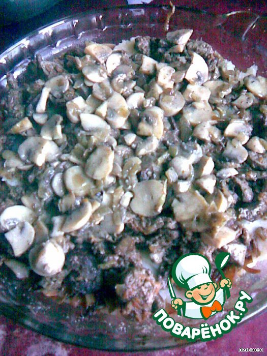Опять картофель и печень. Затем опять картофель и грибы и закрываем запеканку картофельным пюре.
