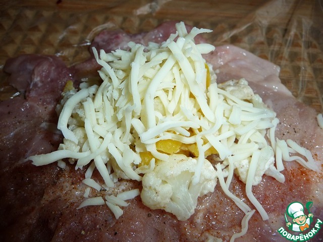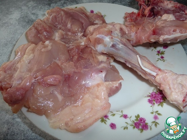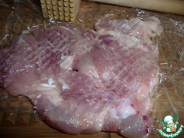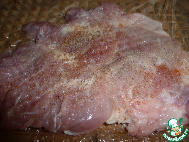 Отбитый окорочок посолить, поперчить, добавить порошок чесночный.