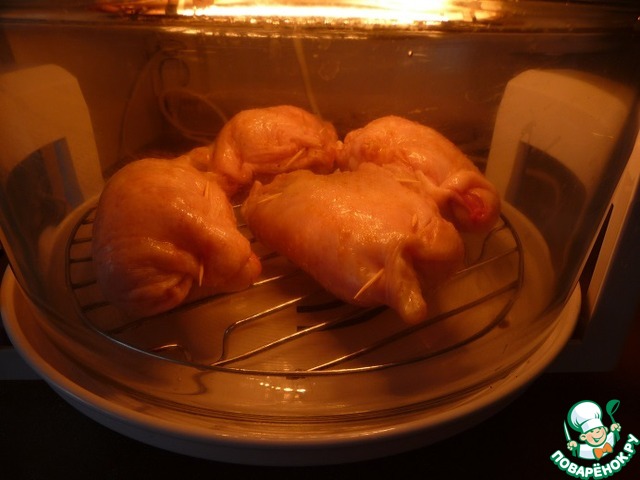 Окорочка смазать маслом с перцем. Поместить на нижную решетку аэрогриля.