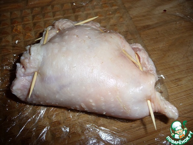 Свернуть в виде конверта или форма вареника и скрепить зубочистками, как бы делая стежок.
