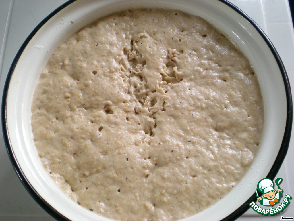 Влить в миску 1 стакан теплого молока, развести дрожжи, всыпать 250 г пшеничной муки, 1 столовую ложку гречневой муки. Размешать все до гладкости. Поставить в теплое место на час, чтобы тесто подошло.
