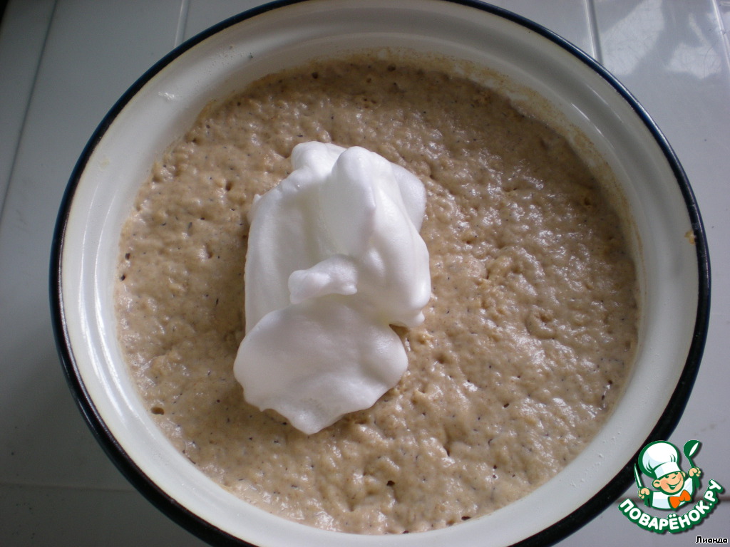 Тем временем взбить белок. Добавить его в поднявшееся тесто. Осторожно перемешать. Дать подняться и сразу жарить на растительном масле.