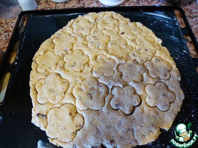 Я раскатывала тесто прямо на противне, смазанном сливочным маслом с обратной стороны, на котором и вырезала печенье