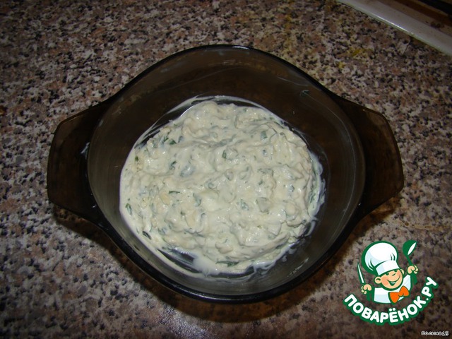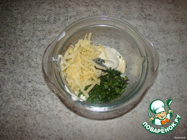 В это время в блендере смешиваем сыр, чеснок, зелень и творог.