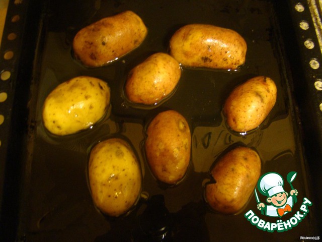Картошку, не почистив, разрезаем пополам и выкладываем на смазанный маслом противень.