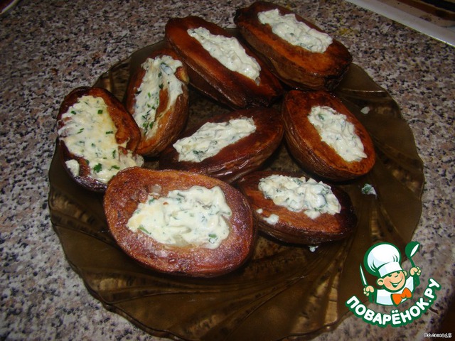 Когда картофель запекся, ножом вырезаем небольшую часть мякоти и начиняем смесью...сыр в смеси начинает чуть плавиться и невозможно оторваться от такой, казалось бы, простой картошки))))