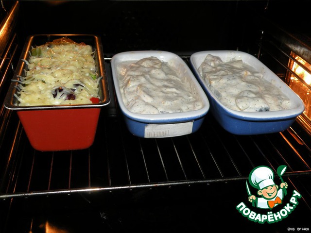 Ставим в разогретую до 180-200*C духовку на час (на фото справа две формы) - то, что запекается слева, это гарнир, кому интересно - добро пожаловать в мои рецепты :-)