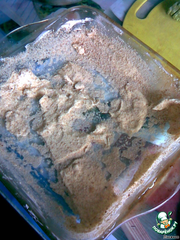 Теперь нужна нам огнеупорная форма. Смазываем ее хорошенько маслом и посыпаем сухарями(я масло положила кусками, только бортики хорошо промазала)