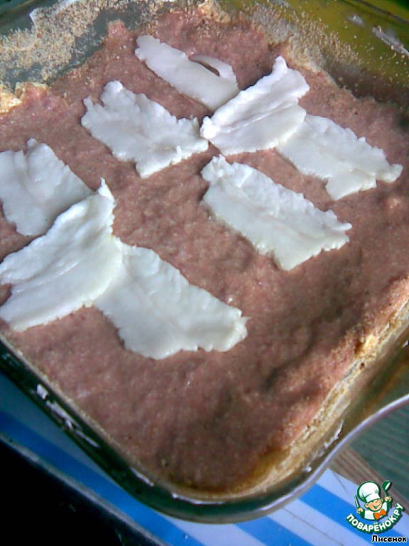 Выкладываем в форму фарш ровным слоем (нужно еще оставить немного для "бортиков")