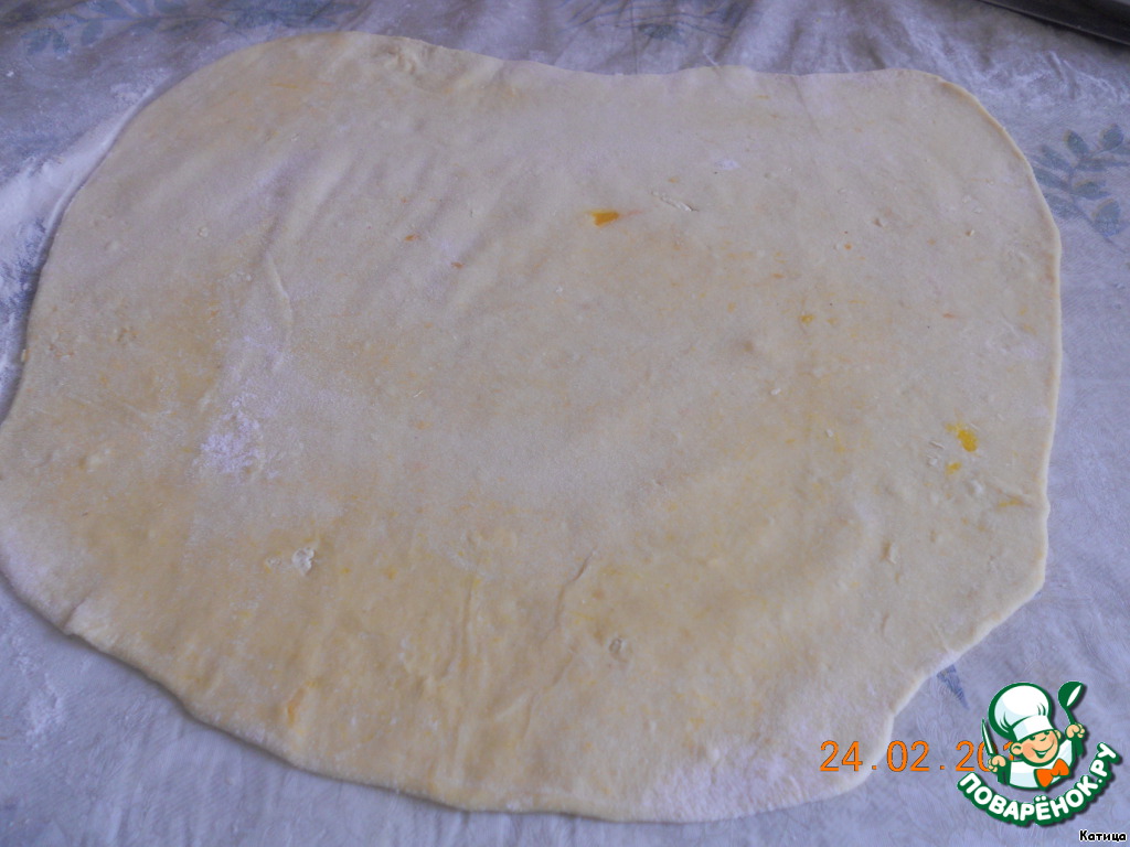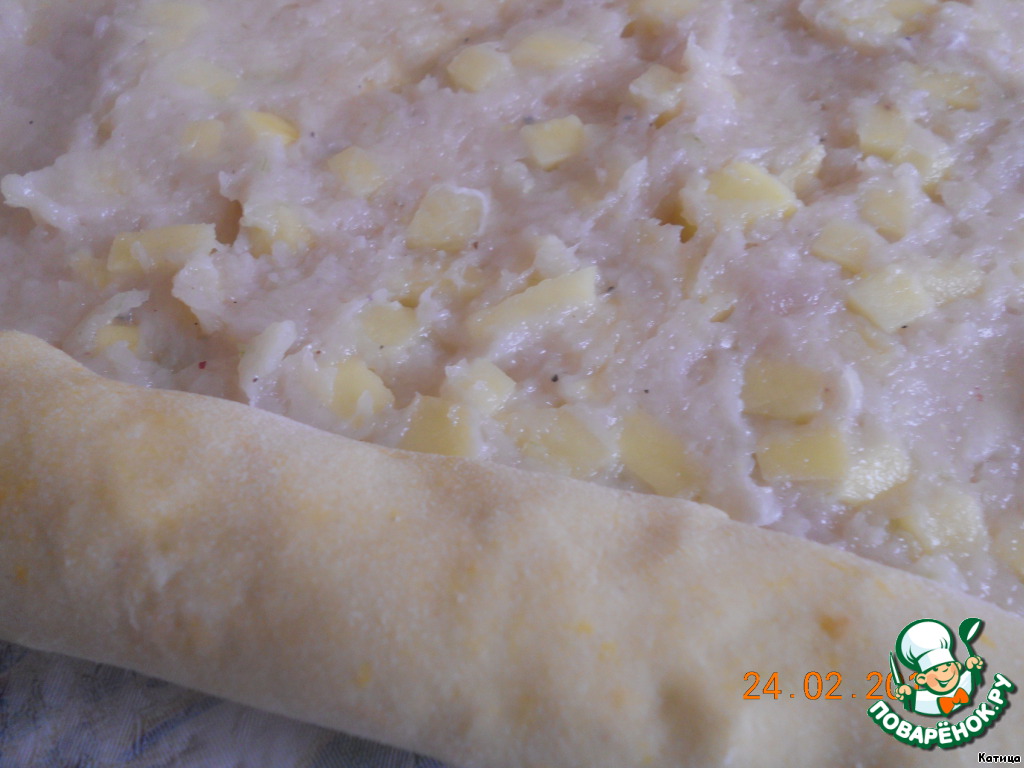 Выкладываем на тесто начинку, распределяем ее по всей поверхности пласта.
